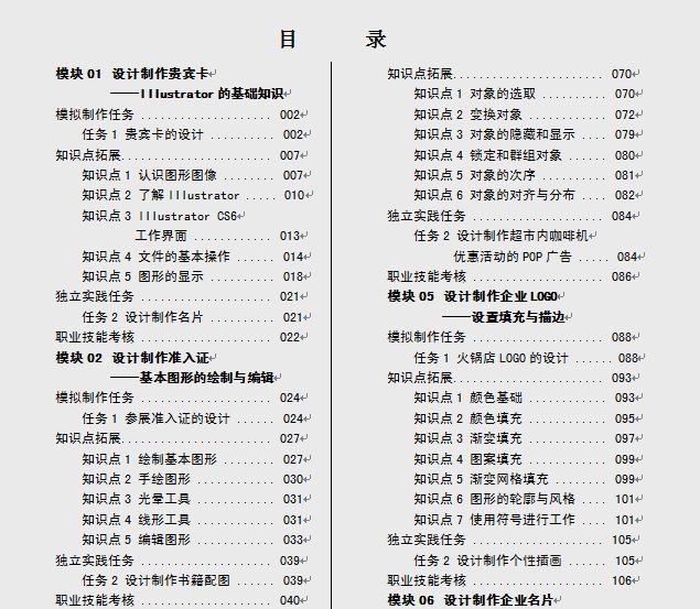 本书内容丰富,采用双线贯穿,一条以选取的具有代表性的商业作品为组织线索,包括贵宾卡、准入证、书籍插画、POP广告、企业LOGO、企业名片、就业人数统计表、活动海报、图书封面等;一条以软件知识为组织线索,包括基本图形的绘制与编辑、绘制和编辑路径、对象的基本操作、填充与描边、文字的使用、图表的创建与应用、混合功能、符号的使用、3D功能和滤镜效果、打印与PDF文件制作等。