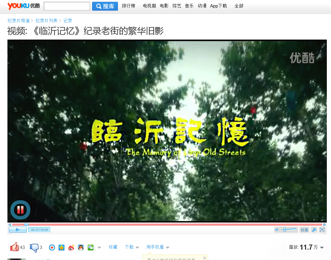 制作纪录片《临沂记忆》,在优酷平台播出仅3天点击率就超过11.7万人。